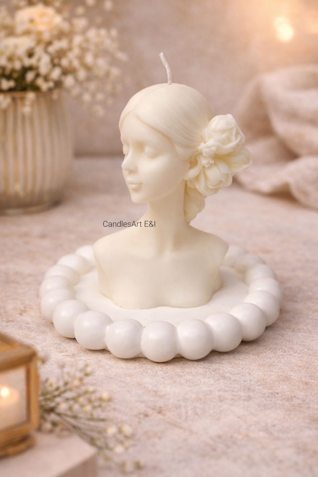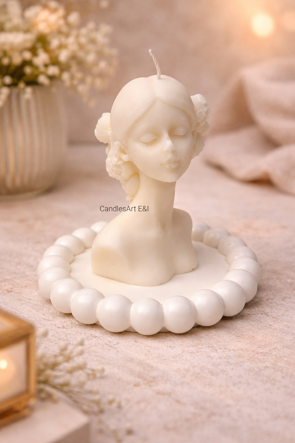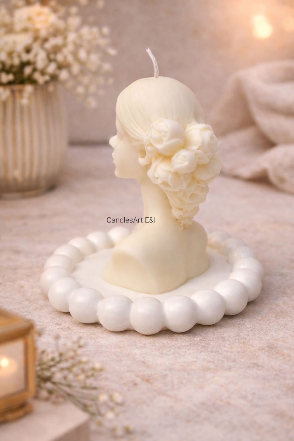 Textura fină a cearăi de soia este uniformă și netedă, iar forma acestei lumânări poate varia de la o figură delicată, precum o siluetă feminină stilizată, la forme geometrice sau naturale. Procesul de fabricație manuală face ca fiecare lumânare să fie unică, aducând o notă personală și autentică în decorul casei tale.